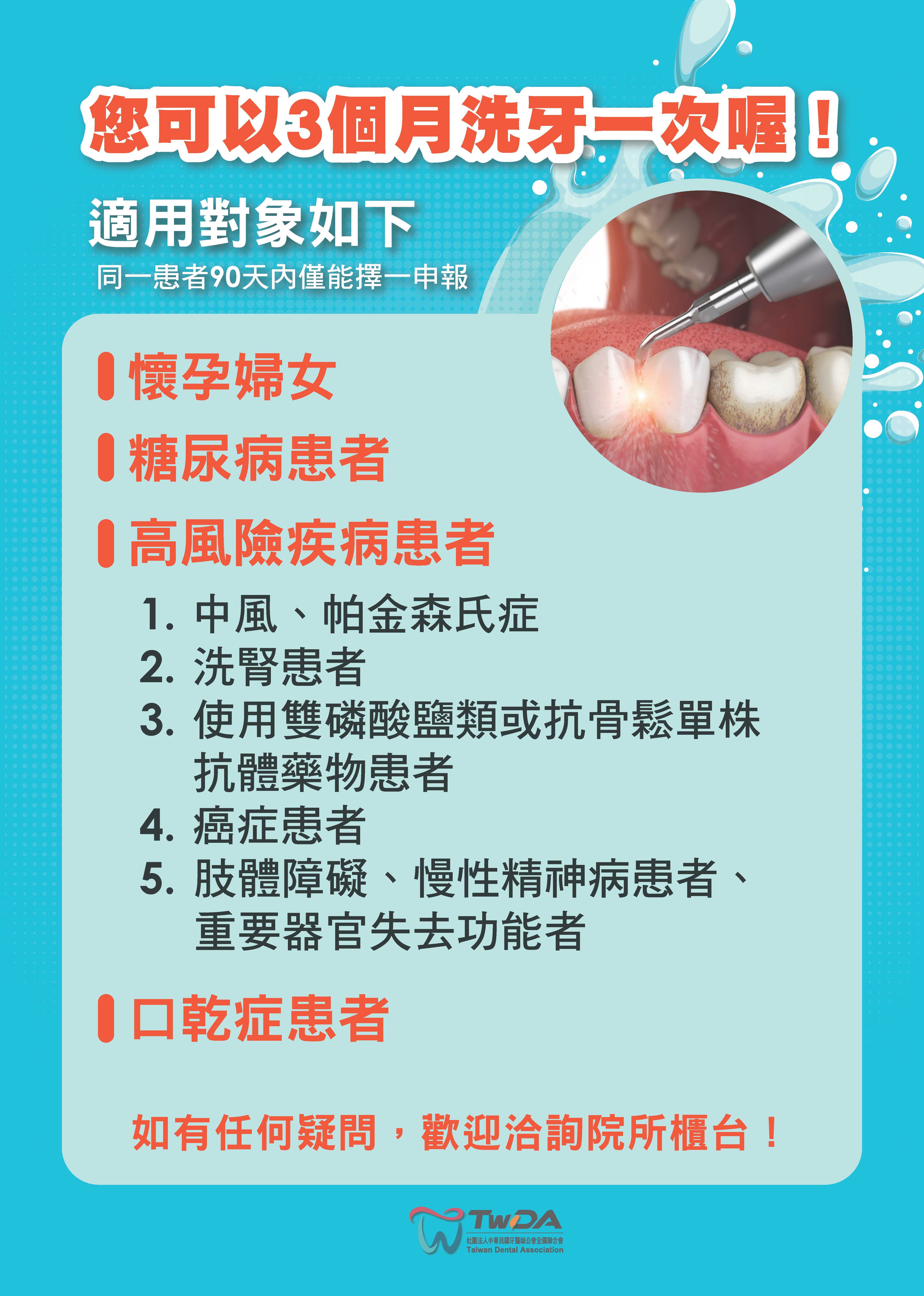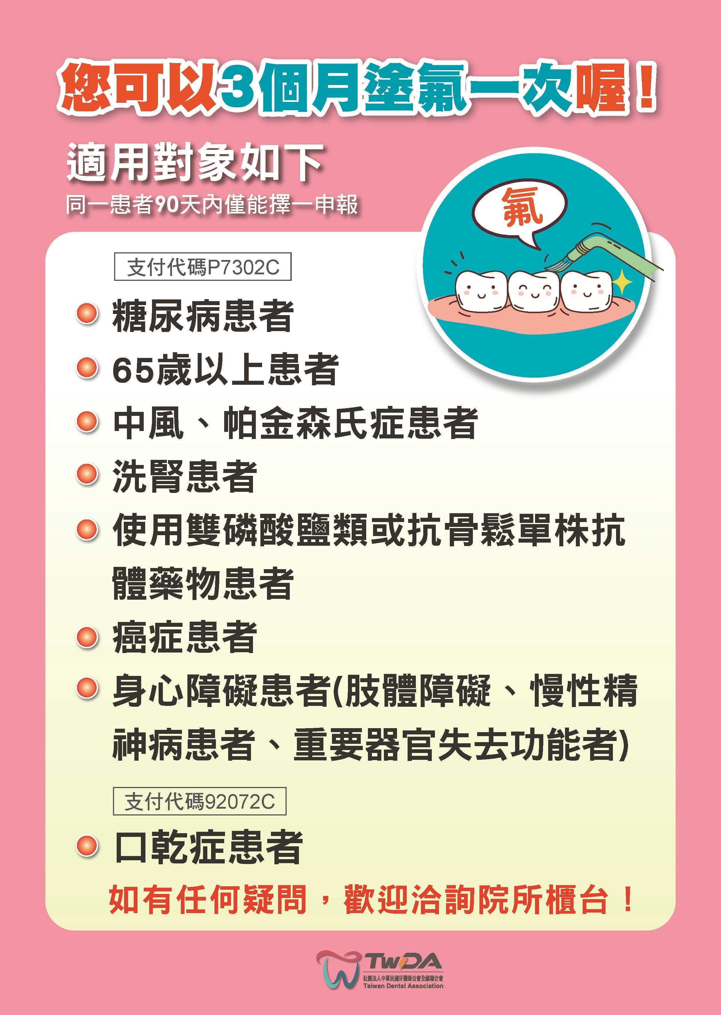 • 糖尿病患者、65歲以上患者、中風、帕金森氏症患者、洗腎患者、使用雙磷酸鹽類或抗骨鬆單株抗體藥物患者、 癌症患者、身心障礙患者(肢體障礙、慢性精神病患者、重要器官失去功能者) 、口乾症患者,每3個月補助1次塗氟。 • 懷孕婦女、糖尿病患者、高風險疾病患者(中風、帕金森氏症患者、洗腎患者、使用雙磷酸鹽類或抗骨鬆單株抗體藥物患者、 癌症患者、肢體障礙、慢性精神病患者、重要器官失去功能者)、口乾症患者,每3個月補助1次洗牙